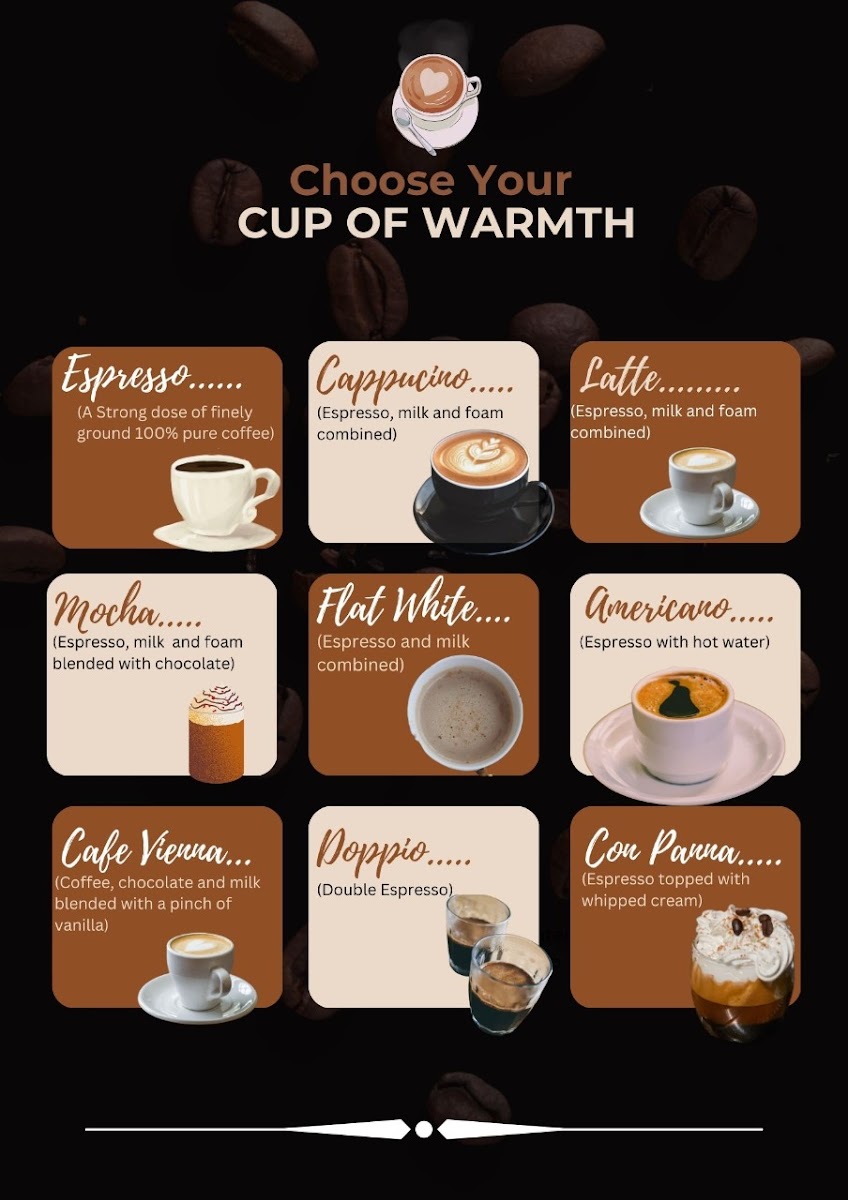 - Beverages: A variety of coffees, teas, and other hot and cold drinks commonly found in cafe settings.